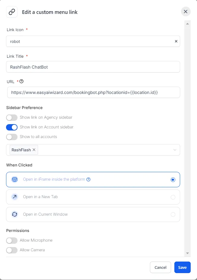 Go to GHL Agency View → Settings → Custom Menu Links