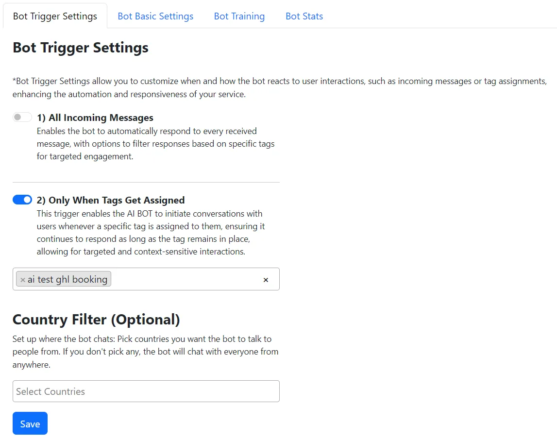 Bot Triggers define when the bot starts a conversation. You can set it to respond to all messages or only when specific tags are assigned, giving you control over its activation.
